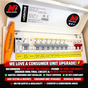 MF Electrical Solutions is a trusted NAPIT-approved electrician in Coventry, providing reliable electrical services across Coventry and Warwickshire. We specialise in: ⚡ EICR inspections & landlord electrical safety certificates ⚡ Consumer unit (fuse board) upgrades ⚡ Fault finding & electrical repairs ⚡ Specialist Full Rewires ⚡ Additional sockets & lighting installations ⚡ LED upgrades & downlights ⚡ EV charger installations We work with homeowners, landlords, letting agents and estate agents in Coventry, Nuneaton, Bedworth, Rugby, Leamington, Kenilworth and Warwick. All work is carried out to the latest BS7671 regulations, fully tested, certified and competitively priced. 📞 Contact MF Electrical Solutions today for a free quote